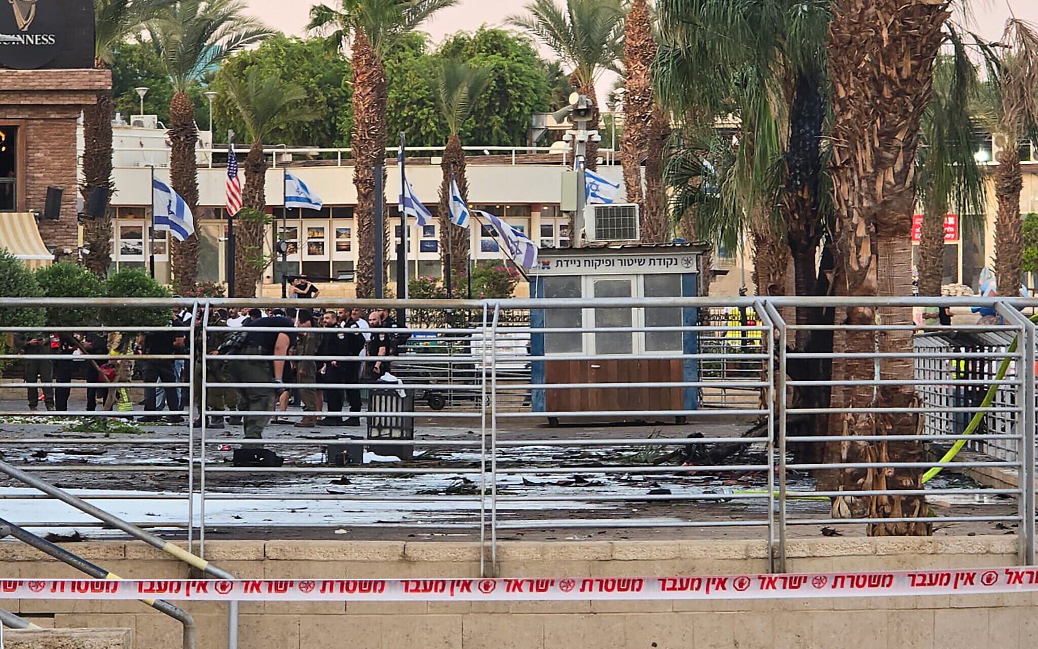 Security forces at the scene of a Houthi drone strike, in Eilat, September 24, 2025. (Yehuda Ben Itach/Flash90)