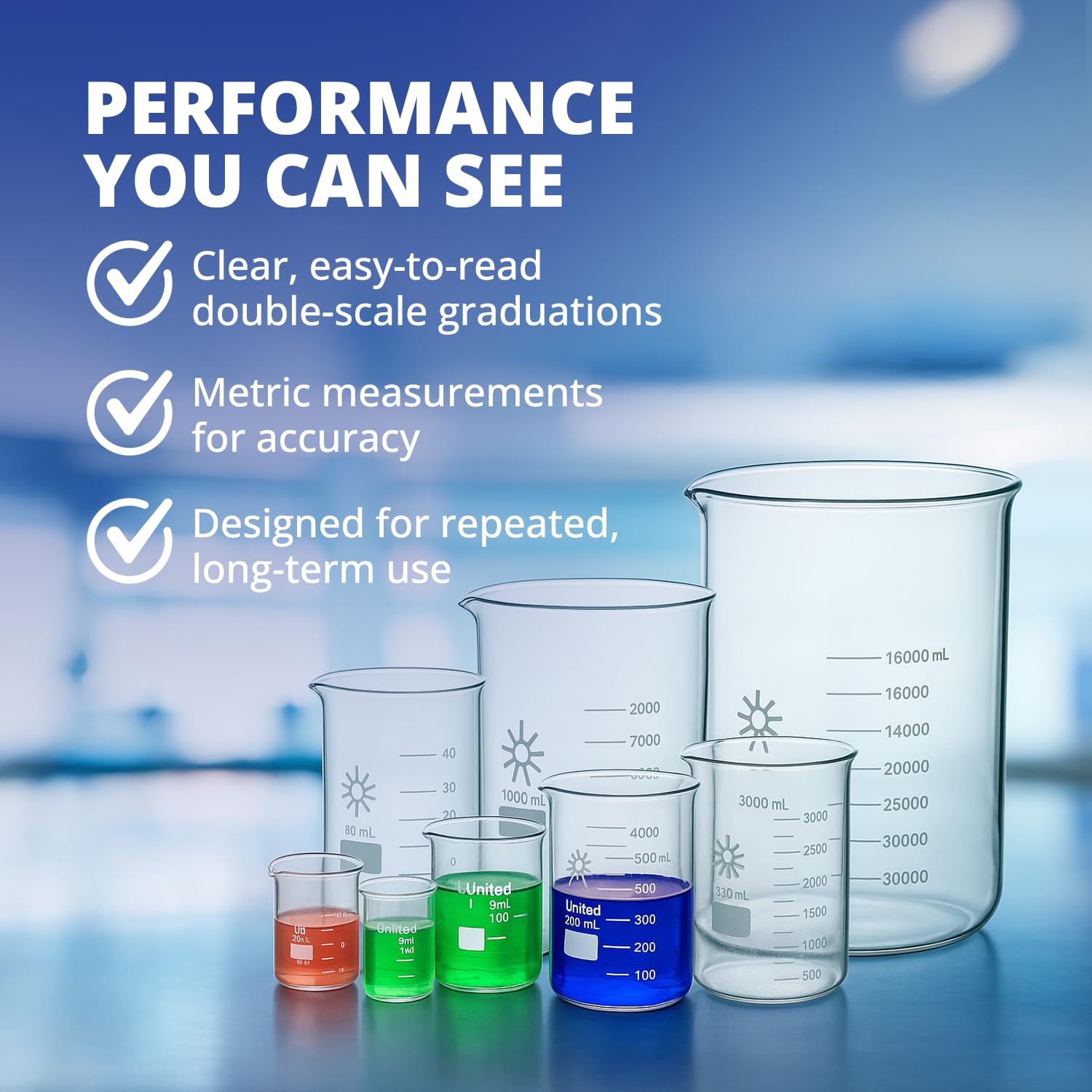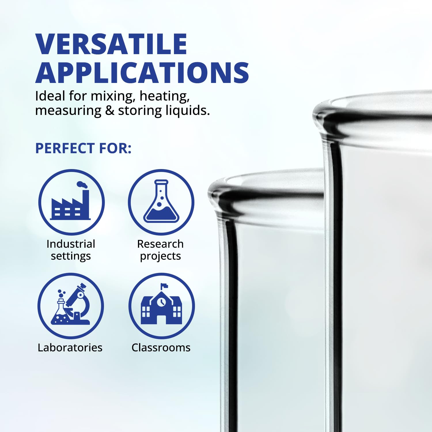 LOW FORM GRIFFIN DESIGN: This low-form chemistry beaker offers a wide base and straight sides for enhanced stability and ease of use during mixing, heating, measuring, and storing liquids. Ideal for classrooms, labs, and industrial settings, these science beakers are reliable tools for students, educators, and professionals.